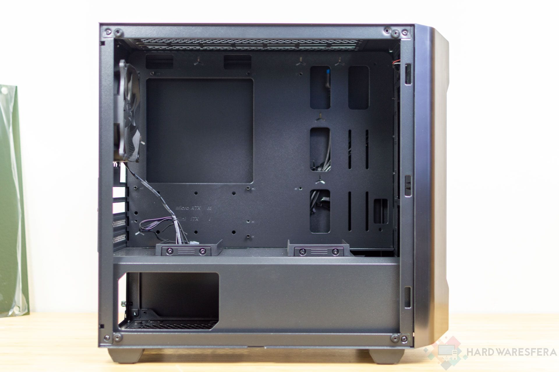 Sobre la cobertura de la fuente de alimentación encontramos tres espacios para unidades SSD de 2.5 pulgadas. Destacar que si ocupamos todos los slots PCI, igual no podemos hacer uso de estos. Adicionalmente detrás de la placa base encontramos espacio para un SSD detrás de la placa base. Cuenta además con dos bahías para unidades de 3.5 pulgadas, que pueden albergar unidades de 2.5 pulgadas.