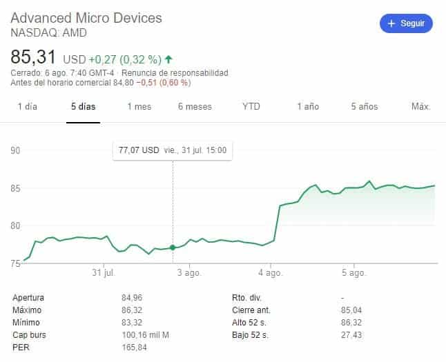 Seguro que la capitalización bursátil de AMD te da bastante igual, pero es el reflejo de la fuerza de la compañía. Las acciones hoy están en 82.7 dólares y ayer estaban a 77 dólares, pero es que el 5 de julio, hace un mes, estaban sobre los 53 dólares. Como cambia la película en un momento.